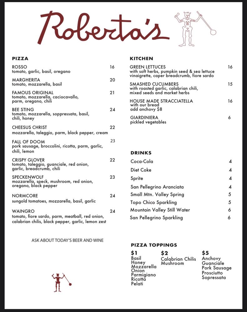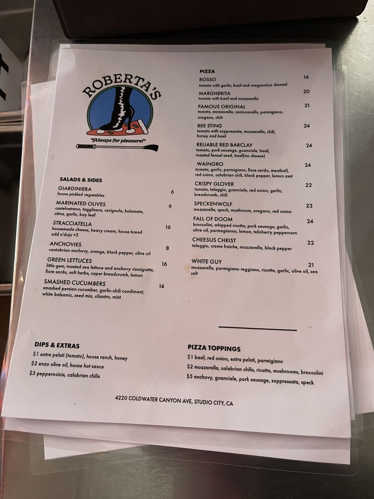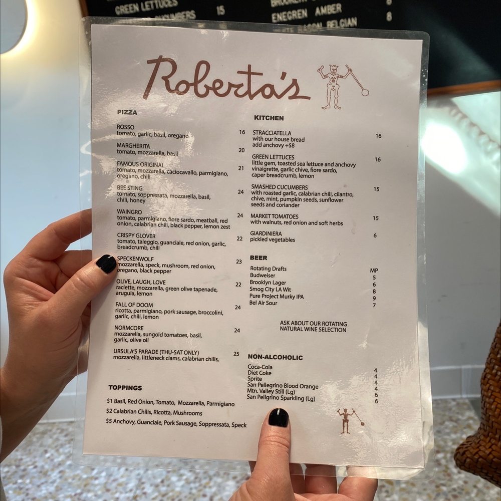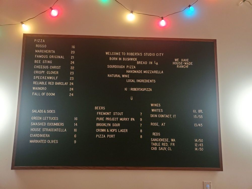 Roberta's is a trendy and hipster restaurant in Los Angeles, offering a unique menu focused on TOGO Pizza, sides, and drinks. The TOGO Pizza options include flavorful choices like the Famous Original with a blend of chili, oregano, and various cheeses, and the Bee Sting with soppressata, chili, and honey. Customers rave about the crispy, thin crusts and delicious toppings, particularly recommending the Bee Sting and Margherita varieties. The sides like Green Lettuces and Stracciatella cheese with house bread provide a delightful complement to the pizzas. While the prices may be on the higher side for some, the quality of the food and the ambiance make it a worthwhile dining experience. The efficient service and cozy outdoor seating add to the overall charm of Roberta's, making it a standout pizza spot to visit in the city.